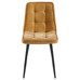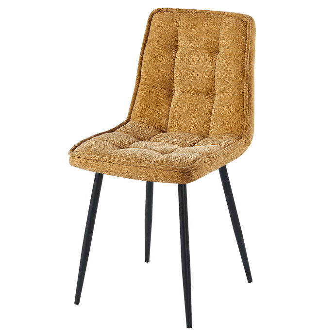 Jedálenská stolička CT-G2048 YEL2 v žltej farbe je čalúnená príjemnou látkou s dizajnovým prešívaním, ktoré dodáva sedadlu aj operadlu výraznú textúru a vizuálny efekt. Pevné čierne kovové nohy zabezpečujú stabilitu a dlhú životnosť, pričom ich povrchová úprava je odolná voči bežnému opotrebovaniu. Stolička nemá podrúčky ani otočný mechanizmus, čo ju robí kompaktnou a vhodnou do menších priestorov alebo jedálenských kútov. Ergonomicky tvarované operadlo podporuje pohodlné sedenie počas jedla alebo stretnutí. Nosnosť stoličky zodpovedá štandardným požiadavkám pre jedálenské sedenie.