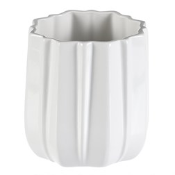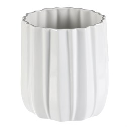 Keramická váza v bielej glazovanej farbe s okrúhlym tvarom a jemným vzorom vlniek na povrchu, dodá vášmu interiéru elegantný a sofistikovaný vzhľad. Jednofarebné prevedenie a hladký dizajn z nej robí univerzálnu dekoráciu a skvelý základ pre obľúbené kvety. Hodí sa svojim dizajnom do akéhokoľvek priestoru, či už na stôl, poličku alebo komodu.
