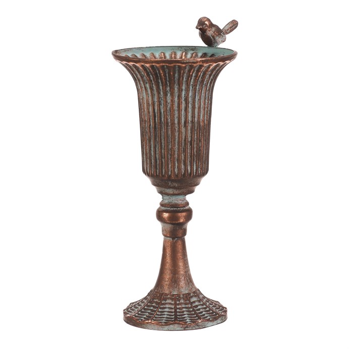 Kovová čaša v medenom odtieni s patinou ponúka dekoratívny prvok s vintage nádychom. Prevedenie je zdobené jemnými rebrami a na okraji je umiestnená malá figúrka vtáčika, ktorá dodáva celku hravý detail. Výška 30 cm umožňuje umiestnenie na komodu, poličku alebo ako súčasť aranžmánu v interiéri aj exteriéri. Povrchová úprava s patinou zvýrazňuje štruktúru kovu a podčiarkuje rustikálny charakter výrobku. Čaša je vhodná na dekoratívne účely alebo ako originálny doplnok záhradného priestoru.