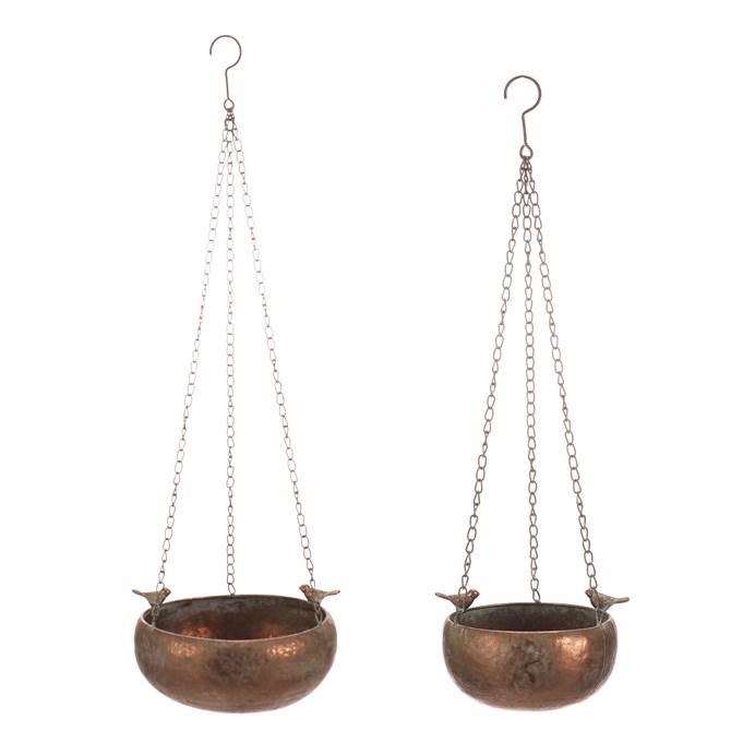 Sada dvoch závesných kovových obalov v medenom odtieni je vhodná na dekoratívne použitie v interiéri aj exteriéri. Každý obal je zavesený na troch tenkých reťaziach, ktoré sú spojené praktickým háčikom pre jednoduché zavesenie. Jemné detaily v podobe malých vtáčikov na okraji dodávajú výrobku originálny vzhľad a vizuálny efekt. Medený povrch s patinou prispieva k rustikálnemu charakteru a ľahkej údržbe. Obaly sú ideálne na kvety alebo iné dekorácie, ktoré vyniknú vďaka ich prevedeniu a zaveseniu.