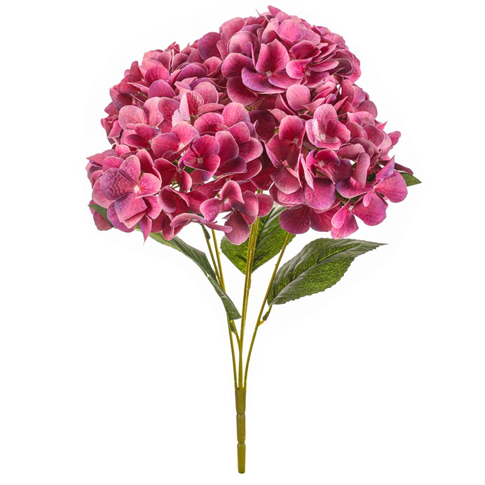 Umelá kytica hortenzie v tmavofialovom odtieni prináša do interiéru príjemný farebný akcent. Kvety sú vyrobené z textilu, ktorý verne napodobňuje štruktúru a jemnosť prírodných okvetných lístkov. Kytica má niekoľko bohatých kvetov s výraznou textúrou a zelené listy, ktoré dopĺňajú celkový vzhľad. Vďaka svojmu prevedeniu je vhodná na dlhodobú dekoráciu bez nutnosti údržby a zalievania. Hodí sa do moderných aj klasických priestorov, kde oživí atmosféru a pridá nádych prírody.