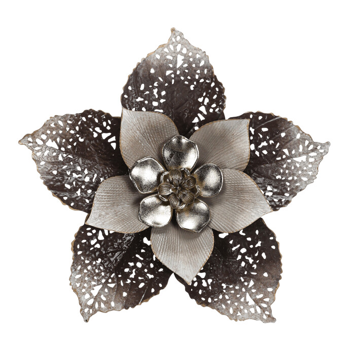 Kovový kvet v ružovo-zlatom prevedení predstavuje štýlovú nástennú dekoráciu, ktorá vynikne v moderných aj klasických interiéroch. Jemne tvarované listy s perforovanými detailmi vytvárajú zaujímavý vizuálny efekt a dodávajú dekorácii ľahkosť. Zlaté stredové okvetné lístky pridávajú nádych luxusu a kontrastu k ružovým odtieňom. Dekorácia je vybavená praktickým závesom pre jednoduché zavesenie na stenu. Je vhodná na oživenie obývacích izieb, chodieb alebo spální.