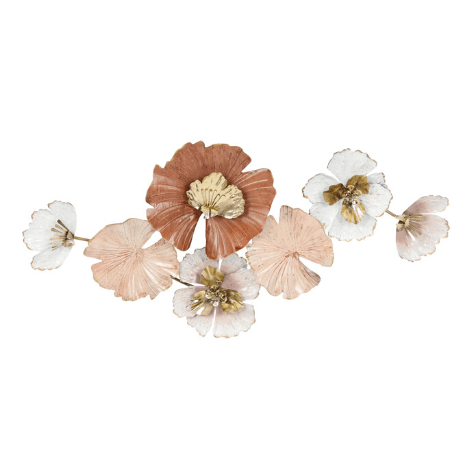 Nástenná dekorácia z kovu predstavuje kombináciu lístkov a kvetov v krémových a zlatistých odtieňoch, ktoré vytvárajú jemný a prirodzený vizuálny efekt. Provedenie jednotlivých kvetov je detailné, s výraznou textúrou a plastickým tvarom, čo dodáva dekorácii hĺbku a zaujímavosť. Vďaka možnosti zavesenia ľahko oživí akýkoľvek interiér, či už v obývacej izbe, chodbe alebo kancelárii. Povrchová úprava kovu je matná s decentným leskom, ktorý podčiarkuje elegantný charakter dekorácie. Veľkosť a rozloženie prvkov umožňuje dekorácii stať sa výrazným doplnkom steny.