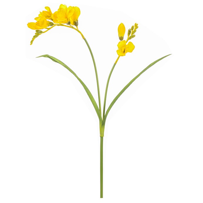 Umelá rezaná kvetina frézia v žiarivej žltej farbe prináša do interiéru svieži a farebný akcent po celý rok. Je vyrobená z plastu, ktorý verne napodobňuje textúru a tvar skutočných kvetov aj listov. Vďaka pevnému stonku a detailnému spracovaniu jednotlivých kvetov a púčikov pôsobí prirodzene a je vhodná na aranžmány v kvetinových väzbách alebo samostatne vo váze. Žlté odtiene oživia každý priestor a dodajú mu príjemnú atmosféru.