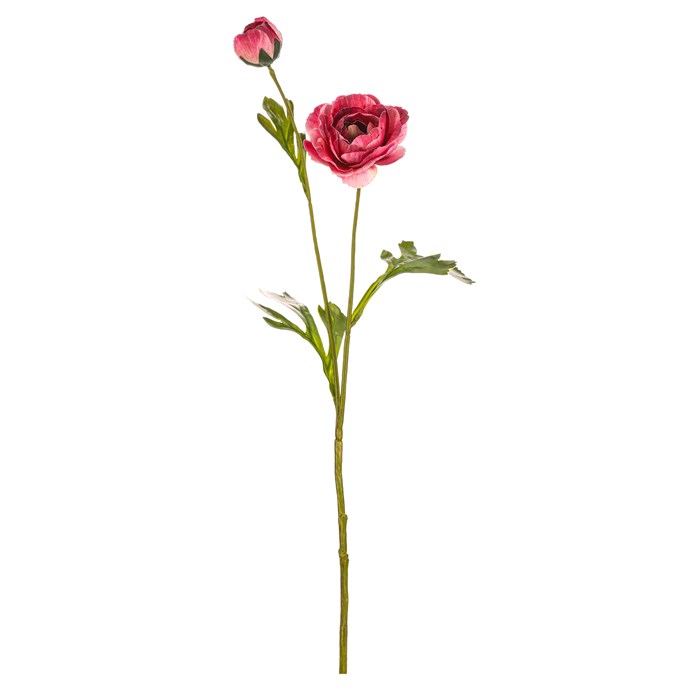 Umelá rezaná kvetina Ranunculus v tmavo ružovom odtieni verne napodobňuje prirodzenú štruktúru a tvar rastliny. Textilný materiál dodáva kvetu jemný vzhľad a príjemnú textúru, ktorá vynikne v rôznych aranžmánoch aj samostatne vo váze. Dlhá stonka s listami umožňuje ľahké zapojenie do dekorácií alebo na vytvorenie kvetinových kytíc. Vhodný je na interiérové ??použitie, kde prináša stálu farebnosť bez nutnosti údržby.
