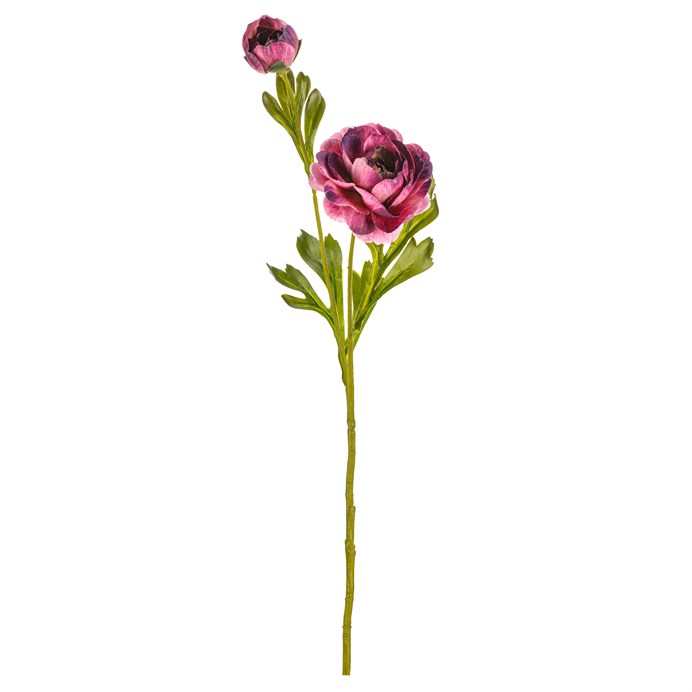 Umelá rezaná kvetina Ranunculus v odtieňoch fialovej farby prináša do interiéru príjemný vizuálny efekt s verným spracovaním textilných okvetných lístkov a listov. Detailné prevedenie stonky a listov vytvára prirodzený dojem, ktorý je vhodný pre aranžmán v kvetinových väzbách, váhe alebo dekoratívnych kompozíciách. Vďaka použitiu textilu sa ľahko udržuje a dlhodobo si zachováva svoj vzhľad. Výška kvetu umožňuje variabilné použitie v rôznych typoch dekorácií.