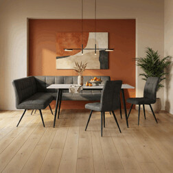 Jedálenský stôl s rozmermi 160x90x76 cm spája moderný dizajn s praktickými vlastnosťami. Doska je vyrobená zo slinutej keramiky v imitácii matného mramoru, ktorá ponúka pevný a odolný povrch ľahko udržiavateľný v čistote. Čierne kovové nohy sú tvarované do mierne zúžených stĺpikov, ktoré zabezpečujú stabilitu a pevnosť celej konštrukcie. Matná povrchová úprava dosky podčiarkuje elegantný vzhľad a zároveň minimalizuje odlesky. Stôl je vhodný na každodenné použitie v jedálňach aj moderne zariadených interiéroch.
