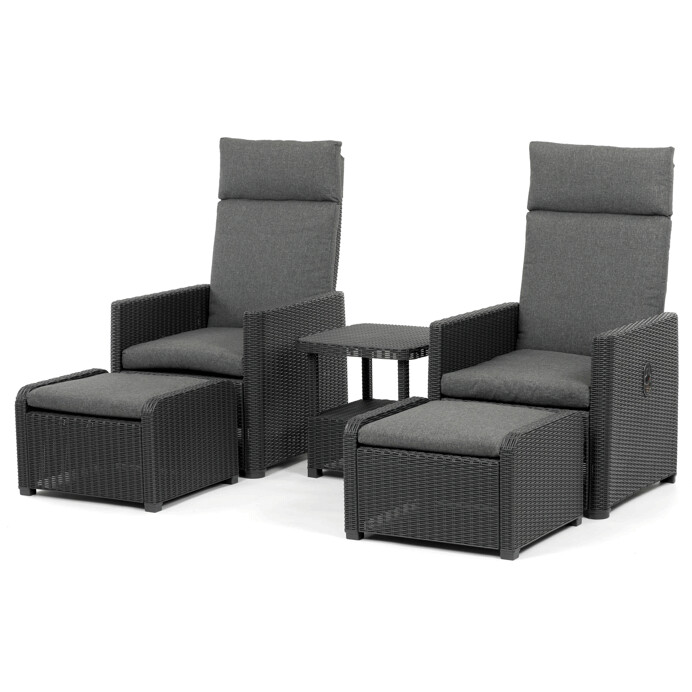 Záhradný set 1+2 v šedom prevedení kombinuje pevný kovový rám s výplňou z polyratanu ktoré zaisťuje ľahkú údržbu a dlhú životnosť aj pri vonkajšom použití. Sada obsahuje dve polohovacie kreslá s nastaviteľným sklonom operadla pre maximálny komfort a dva bonusové taburety, ktoré je možné využiť ako podnožky alebo ďalšie sedacie plochy. Súčasťou je aj praktický stolík s doskou z umelého ratanu, ktorý dopĺňa celkový vzhľad a funkčnosť setu. Ideálna voľba na relaxáciu na záhrade, terase či balkóne.