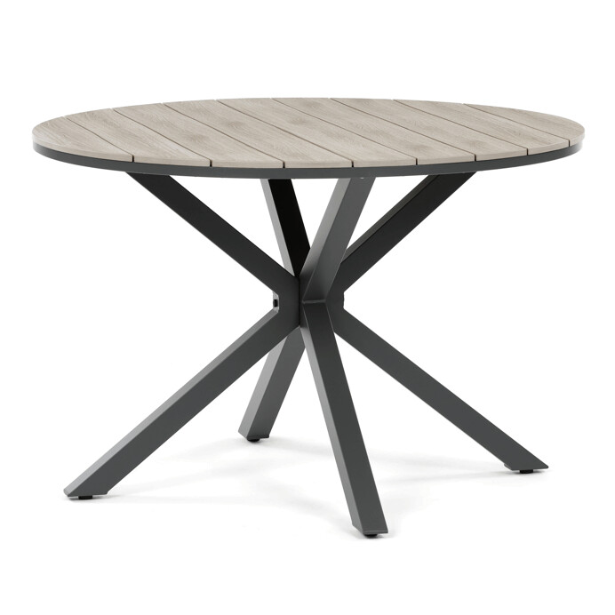 Záhradný stôl s rozmermi 110x75 cm kombinuje pevný sivý hliníkový rám s odolnou doskou z polywoodu v dekore divokého dubu, ktorá verne napodobňuje prírodné drevo. Konštrukcia stola je navrhnutá pre dlhú životnosť a jednoduchú údržbu, pričom hliník zabezpečuje stabilitu a odolnosť voči poveternostným vplyvom. Okrúhly tvar dosky podporuje pohodlné posedenie a umožňuje jednoduchú komunikáciu medzi používateľmi. Vďaka nadčasovému dizajnu sa hodí do rôznych vonkajších priestorov, od terás po záhrady. Stôl je ideálnou voľbou pre relaxáciu aj spoločenské stretnutia pod holým nebom.