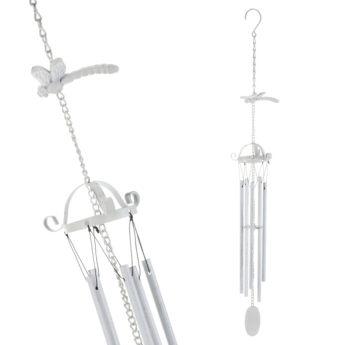 Kovová zvonkohra s motívom vážky v bielom odtieni prináša jemný zvuk a dekoratívny prvok do interiéru aj exteriéru. Jej kovové trúbky sú zavesené na reťazci, ktorý je doplnený o štýlovú vážku, ktorá dodáva zvonkohre originálny vzhľad. Zavesenie na háčiku umožňuje jednoduché umiestnenie na terasu, balkón alebo do záhrady. Zvonkohra vytvára príjemnú atmosféru vďaka ladným tónom, ktoré sa rozoznievajú pohybom vzduchu.